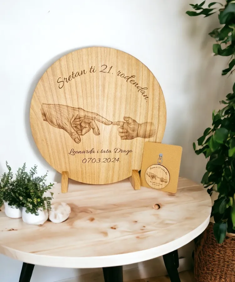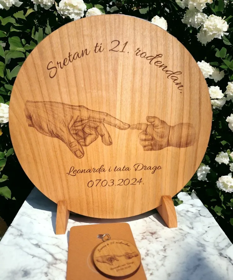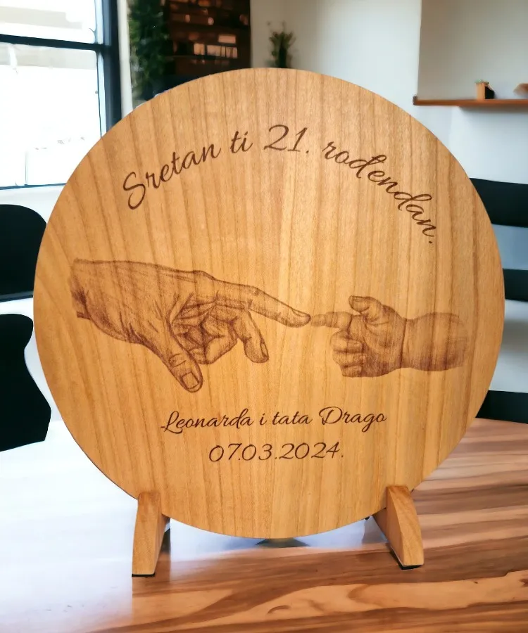 Promjer ovog unikatnog poklona drvenog natpisa je 20 cm, dolazi sa stalkom koji je također izrađen od kvalitetnog drveta.